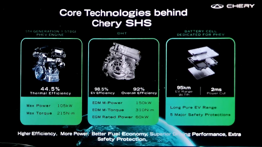 En el caso de Chery el sistema en PHEV con una batería de 18 kWh (aprox.) Vs. las de 1 a 2 kWh de los HEV. Al igual que en un auto 100% eléctrico, el acumulador es chato y va bajo el piso y se “llena” en un cargador para dar entre 70 y 100 km puramente eléctricos.